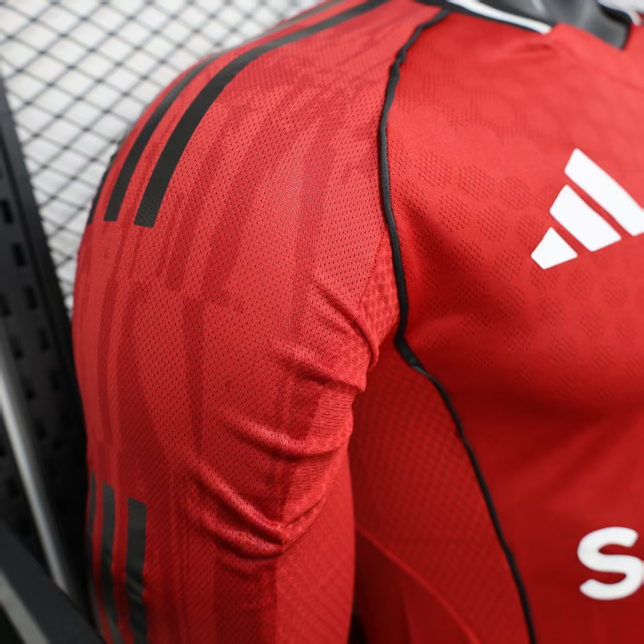 25-26 Manchester United Home Long-Sleeve Jersey: Classic Red Devil red paired with a black-and-white V-neck, with hidden patterns on the sleeves replicating the charm of the Theatre of Dreams.